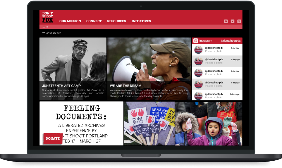 For this project we asked: How might we help Don’t Shoot PDX amplify and clarify their messaging in ways that replicate familiar modalities, ultimately helping to inspire confidence in and motivate users to participate in change-based missions?