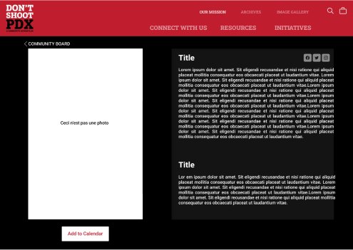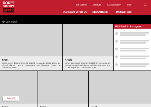 We started visualing an MVP through lofi wireframes in Figma. The challenge here was considering the substantial volume of content currently featured on Don’t Shoot PDX’s site as well as their indiscrimate navigation systems.