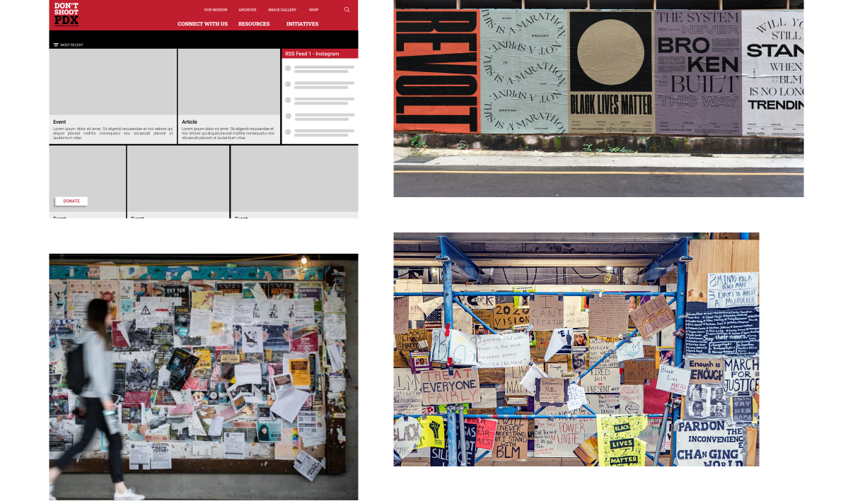 The layout is where our concept most obviously, aesthetically, and effectively intersects with Don’t Shoot PDX’s work and capacity for effective messaging. By looking to the bulletin boards and wild posting practices consistently utilized throughout a sweeping range of social movements, the compelling visuals and writings - the direct reflections of Don’t Shoot PDX’s mission - are authentically elevated.