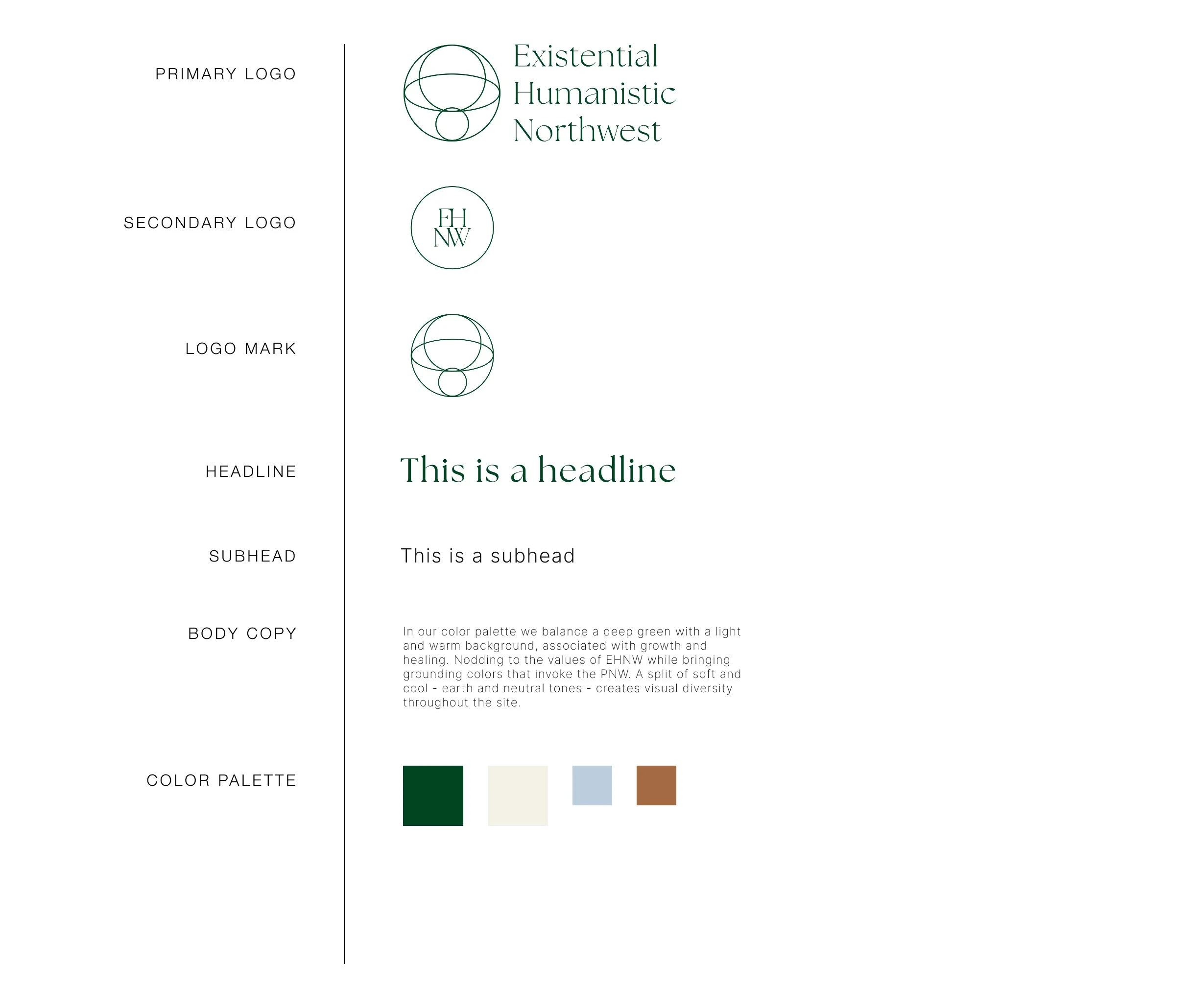 At the center of our color palette we balance a deep green with a light and warm background, associated with growth and healing. Nodding to the values of EHNW while bringing grounding colors that invoke the PNW. A split of soft and cool - earth and neutral tones - creates visual diversity throughout the site.