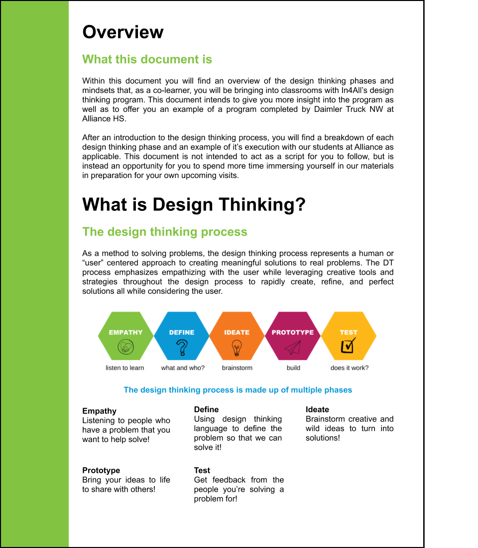 In my role as Design Thinking Program Developer, I developed new instructional materials and curriculum for multiple audiences with unique objectives (while leading the research to do so). I defined the program’s content strategy, and overhauled their materials library to ensure brand guideline adherence.