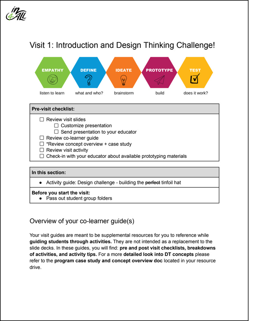 To cultivate increased corporate engagement through deepening current and prospective partner’s understanding of In4All’s DT program and to anchor it within a real world application, I developed a comprehensive program overview.