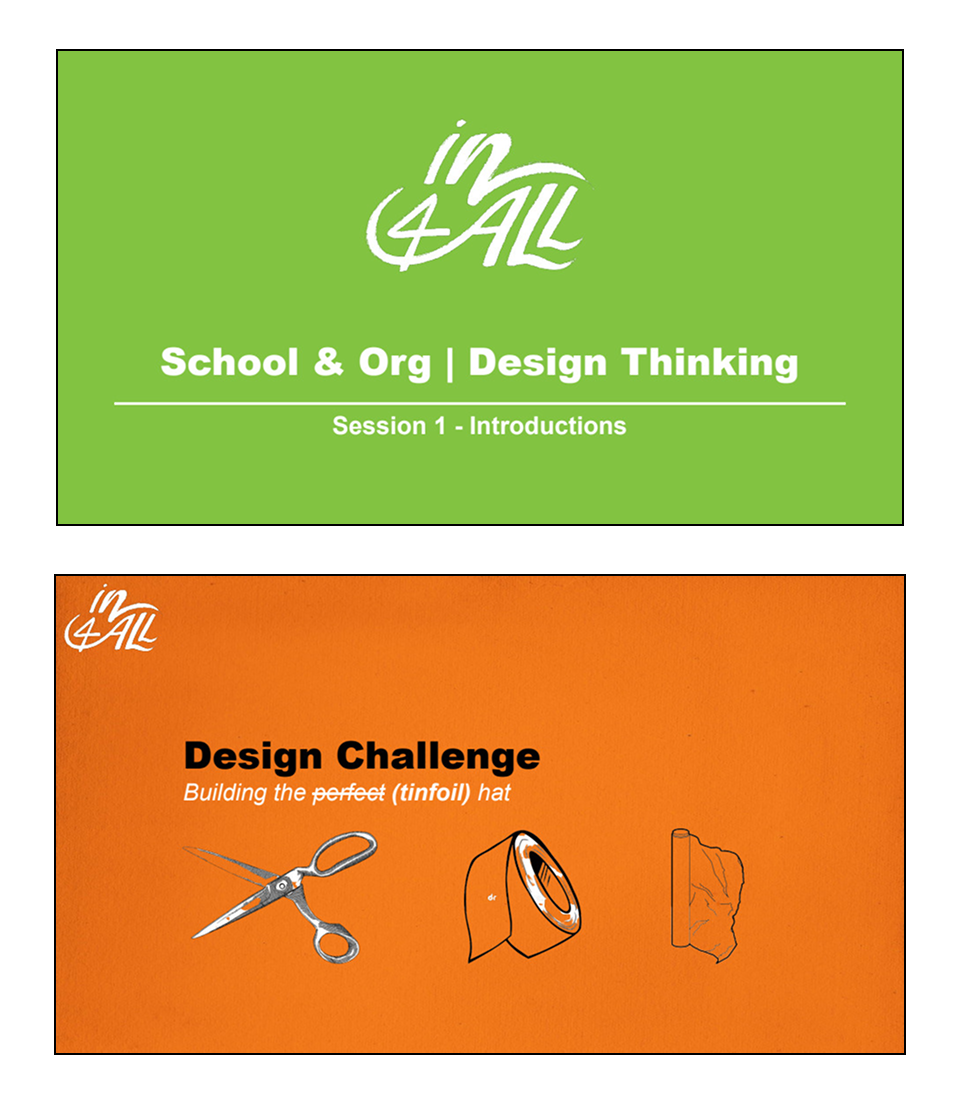 Essential to the program’s success, curriculum in the form of presentations comprise 50% of the materials co-learners bring into classes on In4All’s behalf. Working against increasingly restrictive class schedules, I was tasked with compressing 8 weeks worth of curriculum into 6. In response, I streamlined existing materials, developed new content formats, and introduced design challenges as hands on learning opportunities. The result was presentations with reduced visual static and that prioritized learning by doing over lecture. Materials less demanding of educators and co-learners to prepare and less expectant of students to focus on listening over doing.